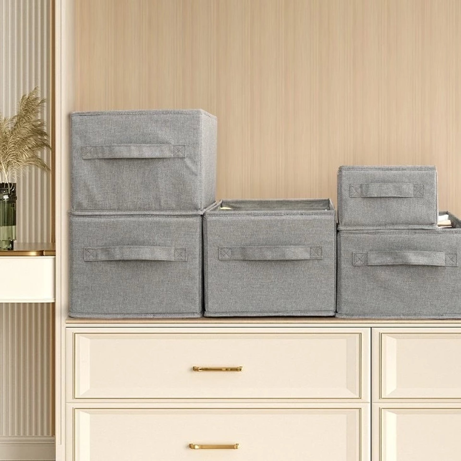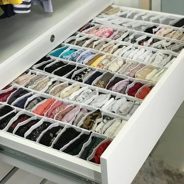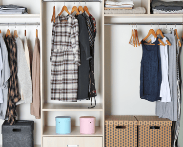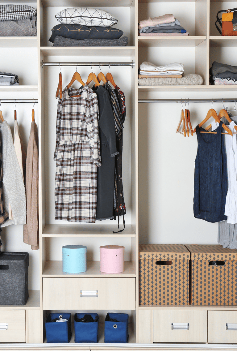 Um guarda-roupa com layout estratégico: roupas penduradas de forma uniforme, caixas para acessórios e divisores de gaveta otimizam o espaço e facilitam encontrar o que precisa em segundos.